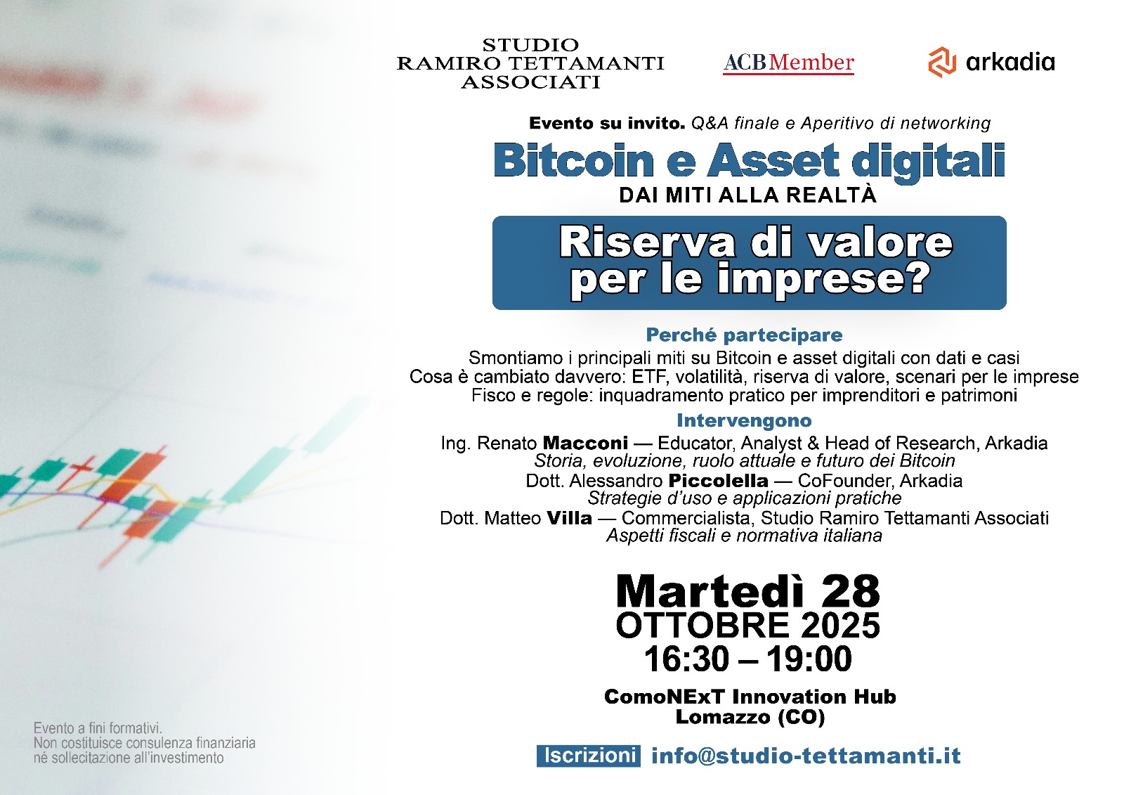 L'appuntamento sarà un'occasione per "smontare" i principali miti su Bitcoin e asset digitali con dati e casi, confrontarsi su cosa è cambiato davvero: ETF, volatilità, riserva di valore, scenari per le imprese e fornire un inquadramento pratico per imprenditori e patrimoni.