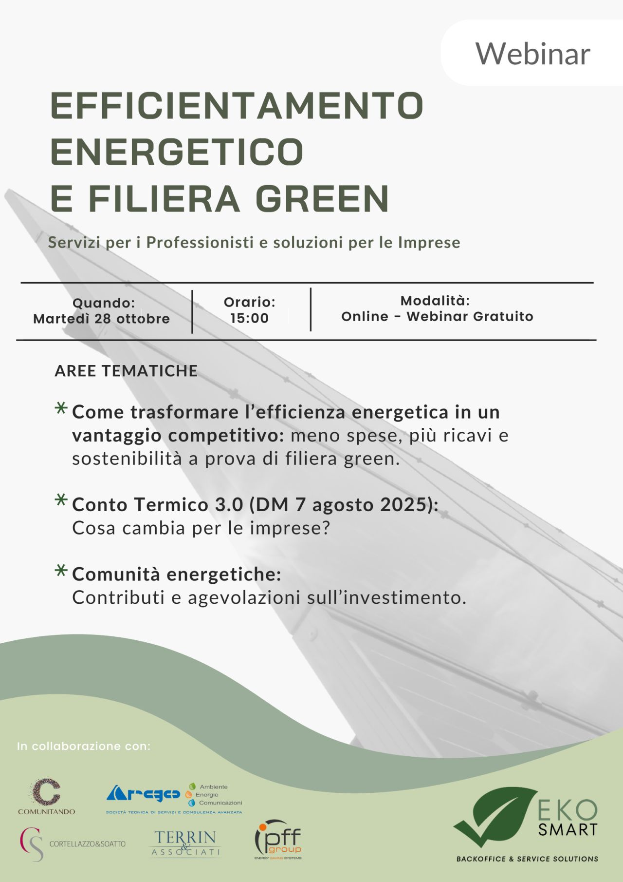 Si terrà il prossimo 28 ottobre il webinar “Efficientamento energetico e filiera green”, promosso da EkoSmart, evoluzione dell’originaria start up EkoPlatform srl, nata nel 2020 per la gestione dell’efficientamento energetico correlato ai Bonus edilizi, i cui servizi di certificazione sono stati sviluppati da TaxKredit Srl, realtà innovativa a cui Cortellazzo&Soatto aderisce fin dal suo avvio.